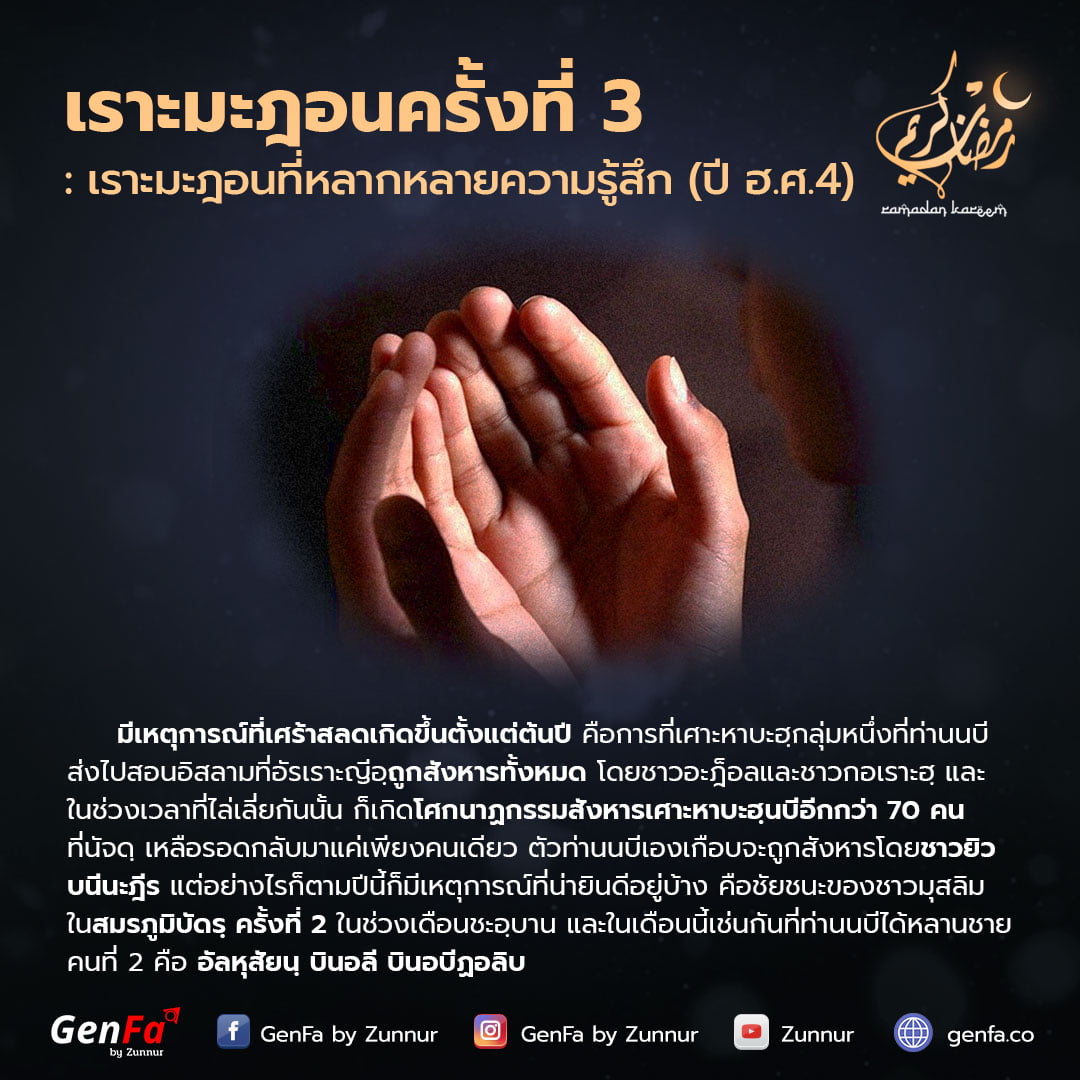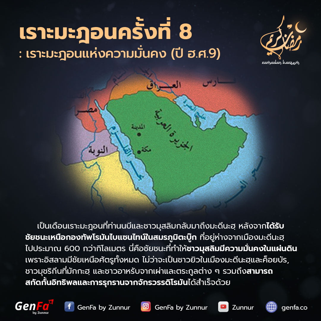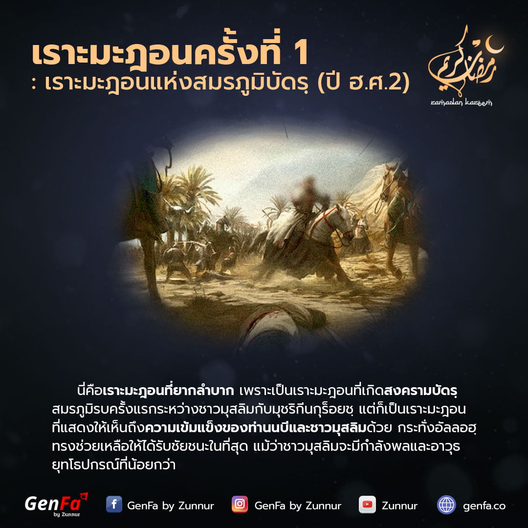 เม.ย.212023:: เราะมะฎอน 9 ครั้งของท่านเราะสูลุลลอฮฺ ::ต่อไปนี้คือเราะมะฎอนทั้ง 9 ครั้งของท่านนบี ศ็อลลัลลอฮุ อะลัยฮิ วะสัลลัม โดยเริ่มตั้งแต่ปี ฮ.ศ.2 ที่การถือศีลอดถูกบัญญัติเป็นครั้งแรก กระทั่งท่านนบีเสียชีวิตลงในวันที่ 12 เดือนเราะบีอุลเอาวัล ปี ฮ.ศ.11 Post navigationPreviousPrevious post:25 เราะมะฎอน ฮ.ศ.8 : อุซซาถูกทำลายสิ้นNextNext post:26 เราะมะฎอน ฮ.ศ.9 : ท่านนบีกลับมาจากสงครามตะบู๊กบทความที่เกี่ยวข้อง7 อาณาจักรใหญ่ในยุคที่นบีมุฮัมหมัดถูกส่งมาสิงหาคม 1, 2025การบริจาคที่ดีที่สุดสิงหาคม 1, 2025ความกล้าหาญของ “สุลฏอนุล อุละมาอ์กรกฎาคม 23, 2025อัลกุรอานคำต่อคำ : สูเราะฮฺที่ 077 อัลมุรสะลาตเมษายน 17, 2025