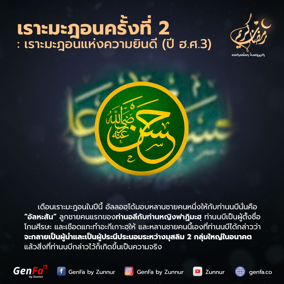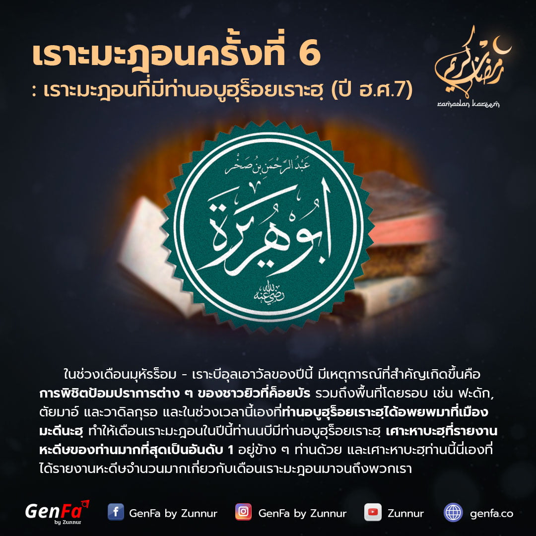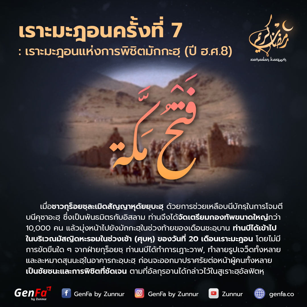 เม.ย.212023:: เราะมะฎอน 9 ครั้งของท่านเราะสูลุลลอฮฺ ::ต่อไปนี้คือเราะมะฎอนทั้ง 9 ครั้งของท่านนบี ศ็อลลัลลอฮุ อะลัยฮิ วะสัลลัม โดยเริ่มตั้งแต่ปี ฮ.ศ.2 ที่การถือศีลอดถูกบัญญัติเป็นครั้งแรก กระทั่งท่านนบีเสียชีวิตลงในวันที่ 12 เดือนเราะบีอุลเอาวัล ปี ฮ.ศ.11 Post navigationPreviousPrevious post:25 เราะมะฎอน ฮ.ศ.8 : อุซซาถูกทำลายสิ้นNextNext post:26 เราะมะฎอน ฮ.ศ.9 : ท่านนบีกลับมาจากสงครามตะบู๊กบทความที่เกี่ยวข้อง7 อาณาจักรใหญ่ในยุคที่นบีมุฮัมหมัดถูกส่งมาสิงหาคม 1, 2025การบริจาคที่ดีที่สุดสิงหาคม 1, 2025ความกล้าหาญของ “สุลฏอนุล อุละมาอ์กรกฎาคม 23, 2025อัลกุรอานคำต่อคำ : สูเราะฮฺที่ 077 อัลมุรสะลาตเมษายน 17, 2025